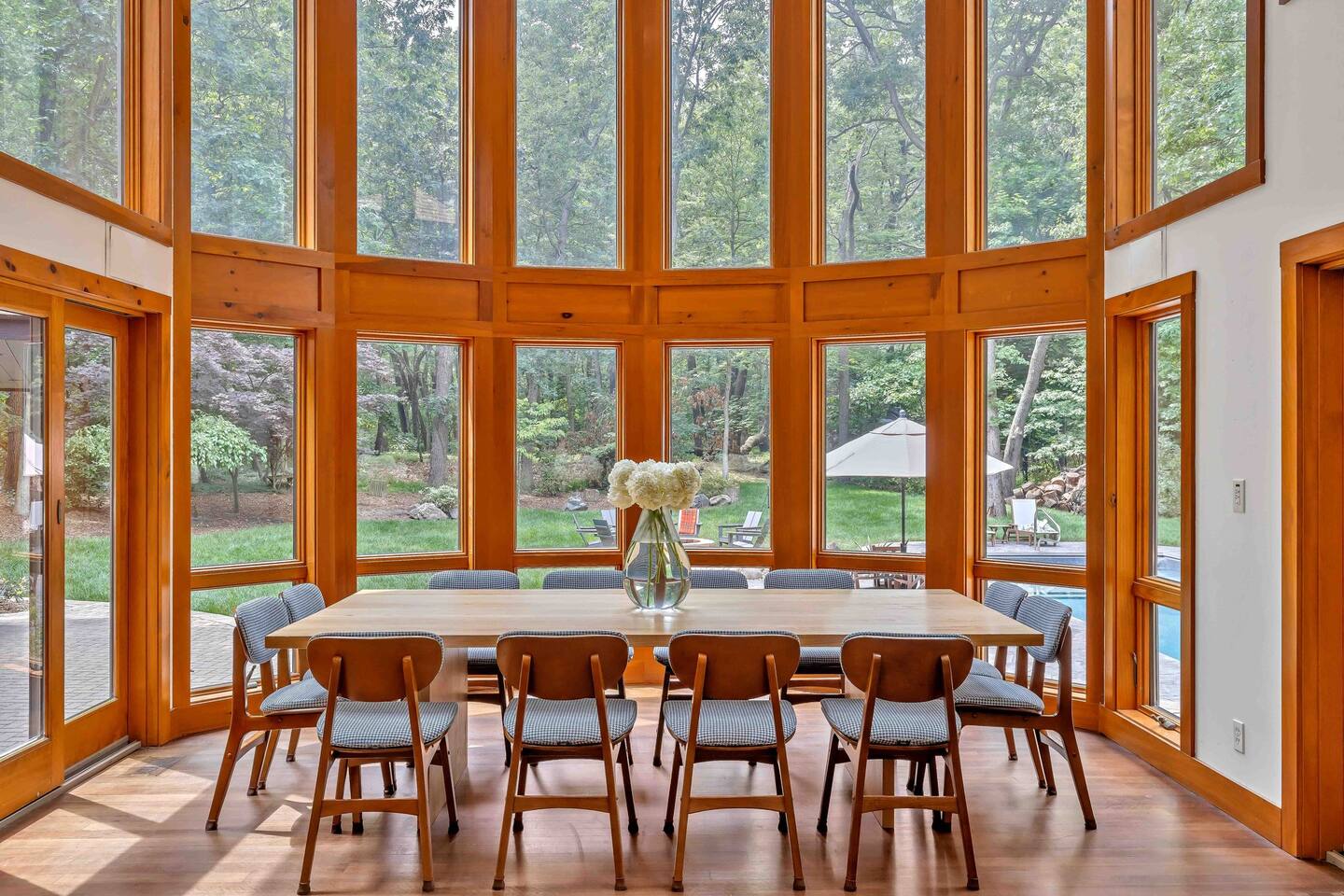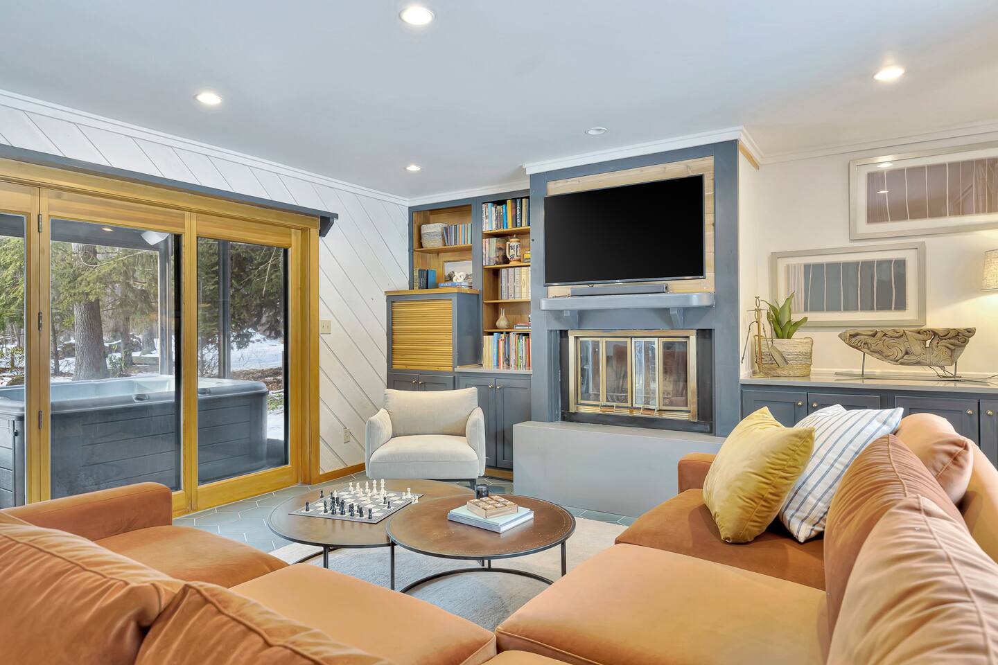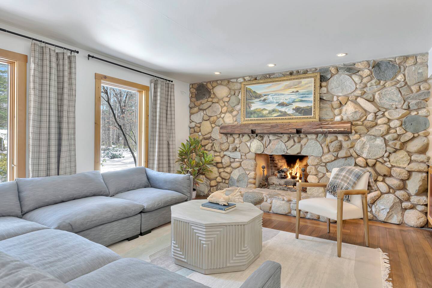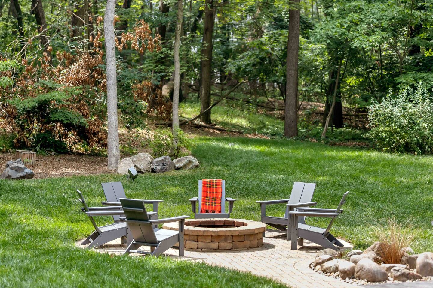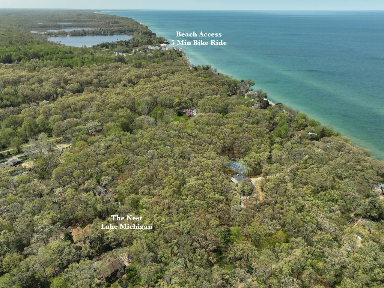 Entirely renovated and thoughtfully designed for multiple families, The Nest Lake Michigan is your home base for laid-back luxury, lakeside adventure, and timeless year round memories. Nestled on a peaceful wooded acre west of Red Arrow Highway, this serene escape is just 90 minutes from Chicago—but feels a world away. Perfectly positioned near all the charming beach towns of Southwest Michigan, The Nest is an equidistant 10-12 minute drive to <b>Warren Dunes State Park and Silver Beach in St. Joseph, with Grand Mere State Park</b> just down the street for hiking, dunes, and nature walks. Bike 12 minutes to the nearest beach access or unwind at home—you may never want to leave. Outside, the grounds are an entertainer’s dream. Take a dip in the new <b>heated pool, unwind in the hot tub, or cook up a feast in the covered outdoor kitchen</b> with a 48" built-in grill, prep sink, ice maker, and plenty of space for cocktails and conversation. Challenge friends to basketball out front or bocce ball in the backyard while the kids enjoy the games, toys, and green space. The interior is equally impressive. A chef’s kitchen anchors the open-concept cooking and dining space with high-end appliances soaring ceilings, a 48" KitchenAid range with griddle, Gaggenau steamer, pot filler, beverage cooler, three prep sinks, and two dishwashers. It’s a space designed for togetherness and ease—whether you’re cooking with local farmstand finds or gathering over a shared meal at the expansive white oak dining table. For indoor entertainment, enjoy a <b>retro arcade, dart board, and six smart TVs</b> (with Roku guest mode for easy log-in/log-out). Spacious bedrooms, multiple lounging areas, and quiet corners make it easy for everyone to relax in comfort. <b>Four gas fireplaces (in both living rooms, and two bedrooms) make it the coziest home for year round relaxation.</b> Practicality is covered, too. A circular drive and full-length driveway lead to a two-car garage, with one bay open for guest use. The other is stocked with seasonal gear: <b>4 adult bikes, 2 mid-size bikes, a Burley double bike trailer, beach chairs, umbrella, cooler, quality pool floats and sand toys and sled</b>—all provided for your stay. Accommodations: • 4 Bedrooms, 4 Full Bathrooms • Two comfortable living spaces + a Lounge • Massive white oak dining room table Outdoor Bliss: • Heated pool and hot tub • Expansive outdoor kitchen • Basketball court and arcade games • Guest-accessible garage loaded with bikes, beach gear, a second refrigerator and dryer Gourmet Kitchen: • Indoor and outdoor cooking facilities • 48" Kitchen Aid Range with griddle • Gaggenau steamer and pot filler Children & Baby Essentials: • Toys, books, games for various ages • Complete set of baby essentials • Retro Nintendo game in bunkroom • Arcade in family room Luxury Amenities: •100% Cotton Sheets •Plush bath and beach towels •Complimentary toiletries •Coffee starters and culinary basics Location Perks: •12-minute bike ride to the nearest beach •Close proximity to Silver Beach, St. Joseph's, and •Warren Dunes State Park •Minutes from the Lake Michigan Shore Wine Trail