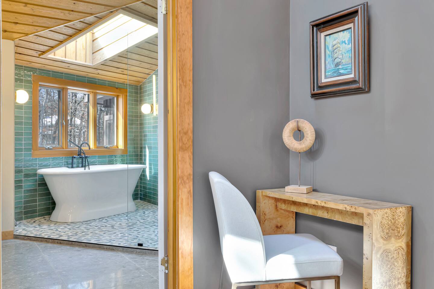Set on a peaceful wooded acre, the retreat is located west of Red Arrow highway and just a 12 minute bike ride to the nearest beach access. Situated just north of Harbor Country and minutes from the Lake Michigan Shore Wine Trail, the home is equidistant to Silver Beach/St. Joseph's and Warren Dunes State Park. Nature abounds as we are also a stone's throw from Grand Mere State Park where you can go on a leisurely or active hike and enjoy the beach.