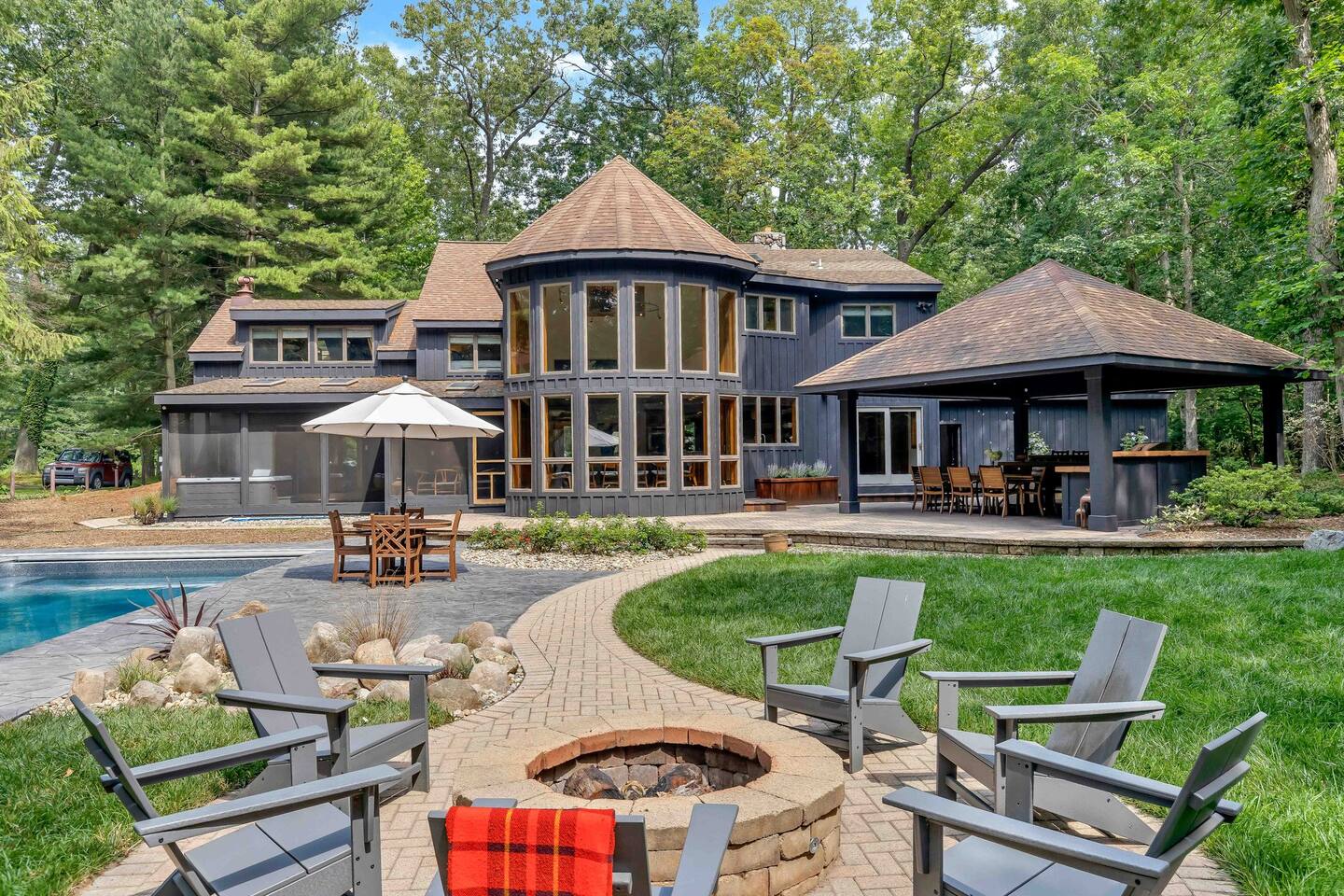 Entirely renovated and outfitted for multiple families, The Nest Lake Michigan is the perfect place for your next escape from the ordinary. Convenient to all the adorable beach towns of SW Michigan, and 90 mins from Chicago. The grounds feature a heated pool, hot tub, unrivaled outdoor kitchen, games, toys, books, and all the luxury amenities you need for the ultimate staycation. Bike 12 minutes to the nearest beach access, or drive 12 mins N to St. Joe's, or 8 mins S to Warren Dunes.